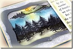 What do you think? I’m not a creative scenery stamper but it was done easier than I thought, thanks to RI’s awesome stamps!! I used Mountain Vista (629-I) , Large Pine Forest (2709-I) and Small Pine Tree (2710-D) to create the scene. After the Mountain Vista image was colored with Copic markers, I sponged for the whole scene to add more colors. Then I simply stamped the pine tree images. I also off-stamped the same tree images and blended the color with blender pen to create the shadow. For the sentiment, I stamped Life Is Not…(6113-K) on the white mat, punched the edges with the border punch. Then I masked the edge and sponged the inside of the mask. To finish off, I dressed the sentiment mat with the satin ribbon.